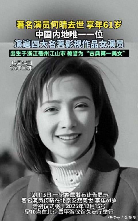 2025年12月13日何晴的家属发布了讣告告知外界这位女演员已在北京安然离世享年61岁讣告中还公布追悼会将于2025年12月15日上午10点在北京昌平殡仪馆久安厅举行。